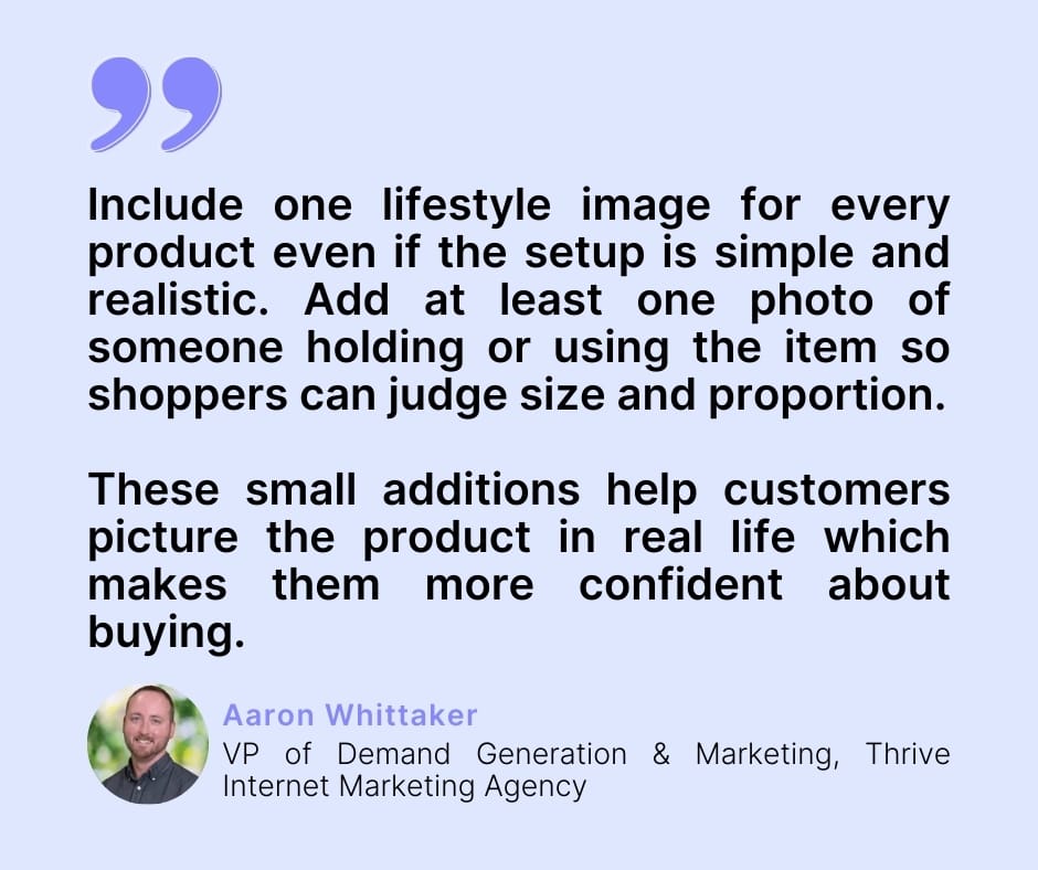 If I want that effect to happen consistently I don't depend solely on standalone product shots. I add at least one strong lifestyle image that shows the product in its natural environment so the shopper can picture it in context. A coffee mug looks different on a warm desk beside a laptop than it does floating on a white background. I also use what I call the rule of hand. Showing a real hand holding, pressing, gripping or wearing the product instantly communicates scale, weight and usability without extra copy. It gives the brain a physical reference point. That subtle cue makes the item feel tangible instead of abstract and once something feels tangible, clicking "Buy" feels far less risky.
