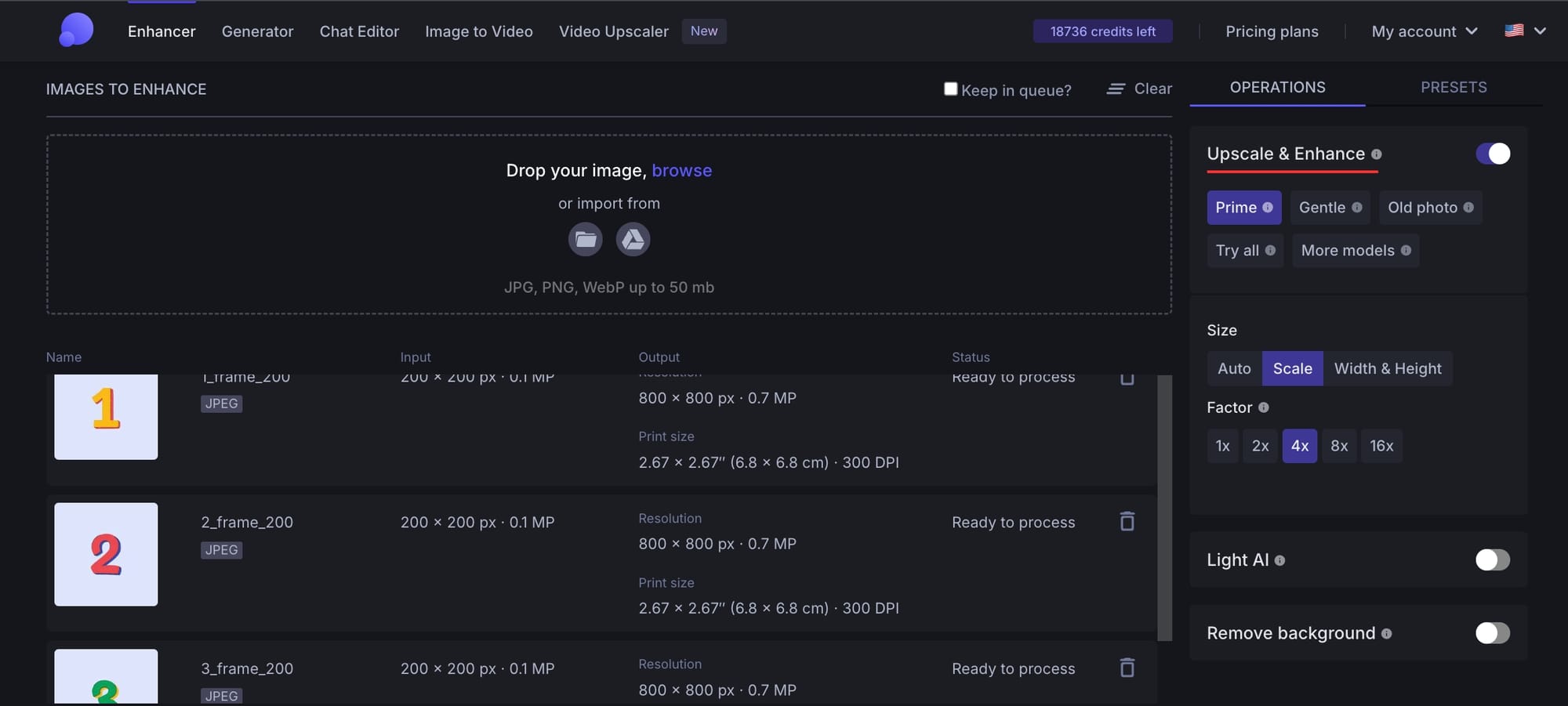 Batch upload all the images you want to use to create a GIF in jpeg, png, or webp formats. If they're pixelated and blurry, LetsEnhance will make them great again.