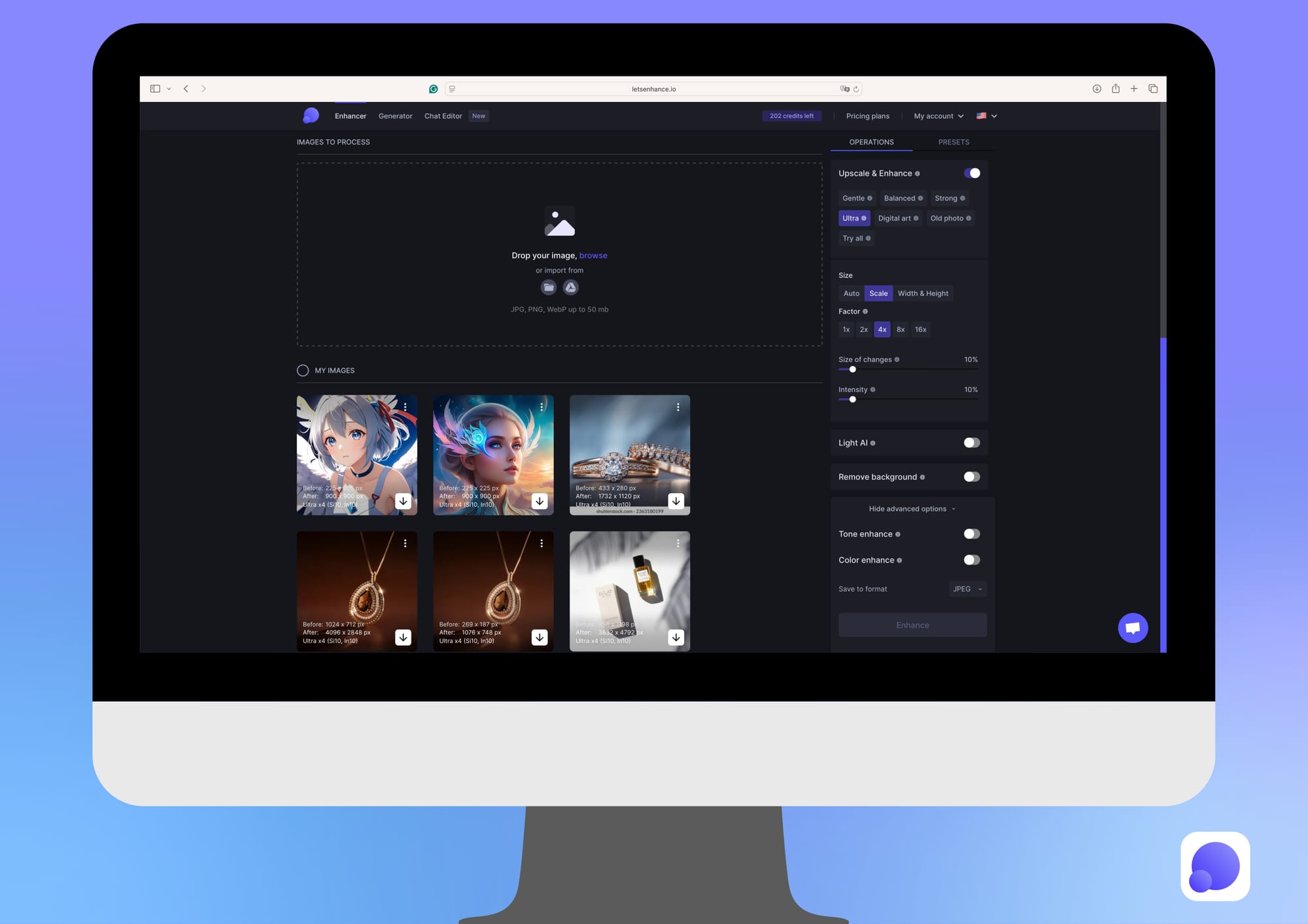 LetsEnhance keeps everything in the browser and in one clean flow. You drop in your image, pick a ready-made option (Ultra for maximum lift, or modes for art, old photos, etc.), and all the useful switches, face fix, background removal, light/tone/color, sit right where you need them.