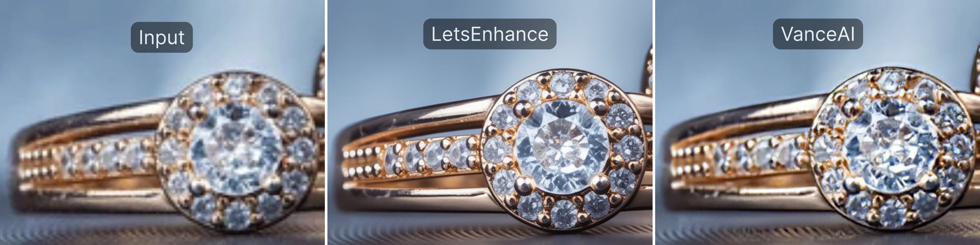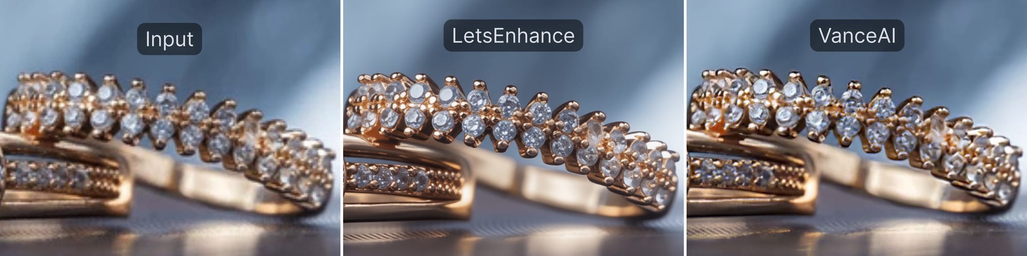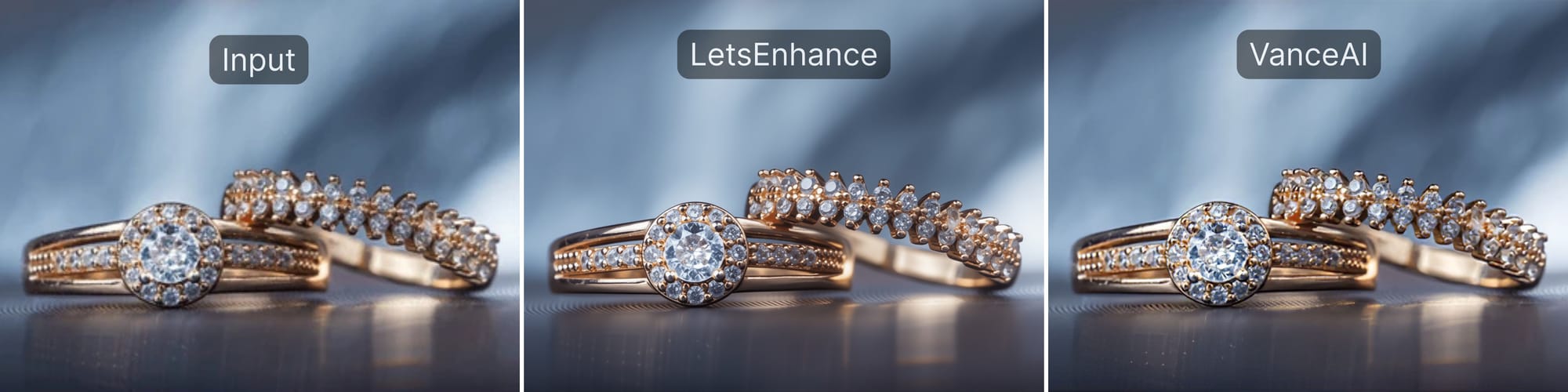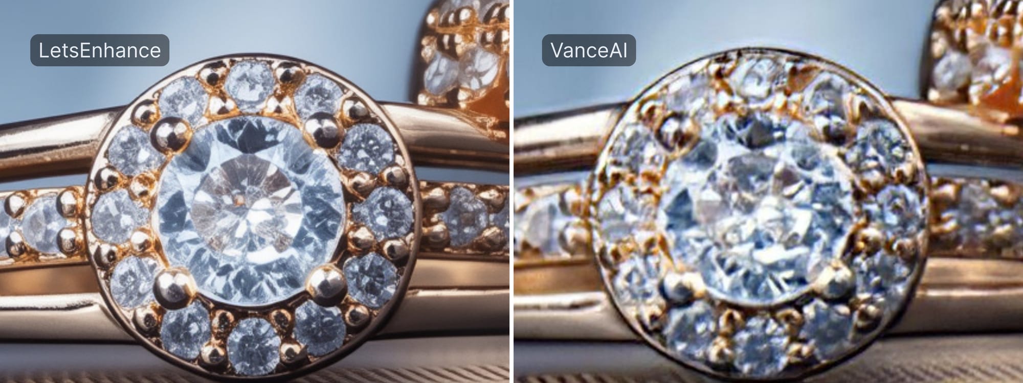 Both tools preserved the overall look and lighting of the jewelry piece (neither introduced color shifts or weird sparkles that weren’t there before), but LetsEnhance’s result had that last bit of “high-definition” precision that can make a jewelry photo pop, especially for print or high-resolution zoom views.