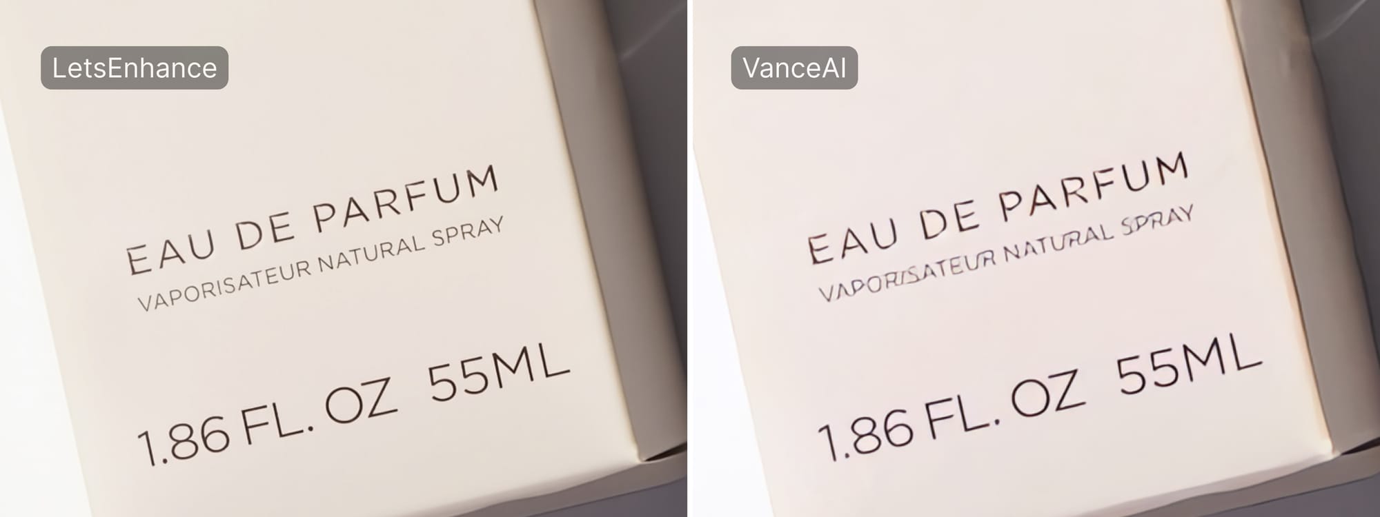 VanceAI’s upscaling also improved the image, but in side-by-side comparison, it was a notch behind in the tack-sharpness of small text. VanceAI’s Text model made the packaging text more legible than the original for sure, but under a magnifying glass, some tiny letters were a bit softer or slightly hazy compared to LetsEnhance’s result.