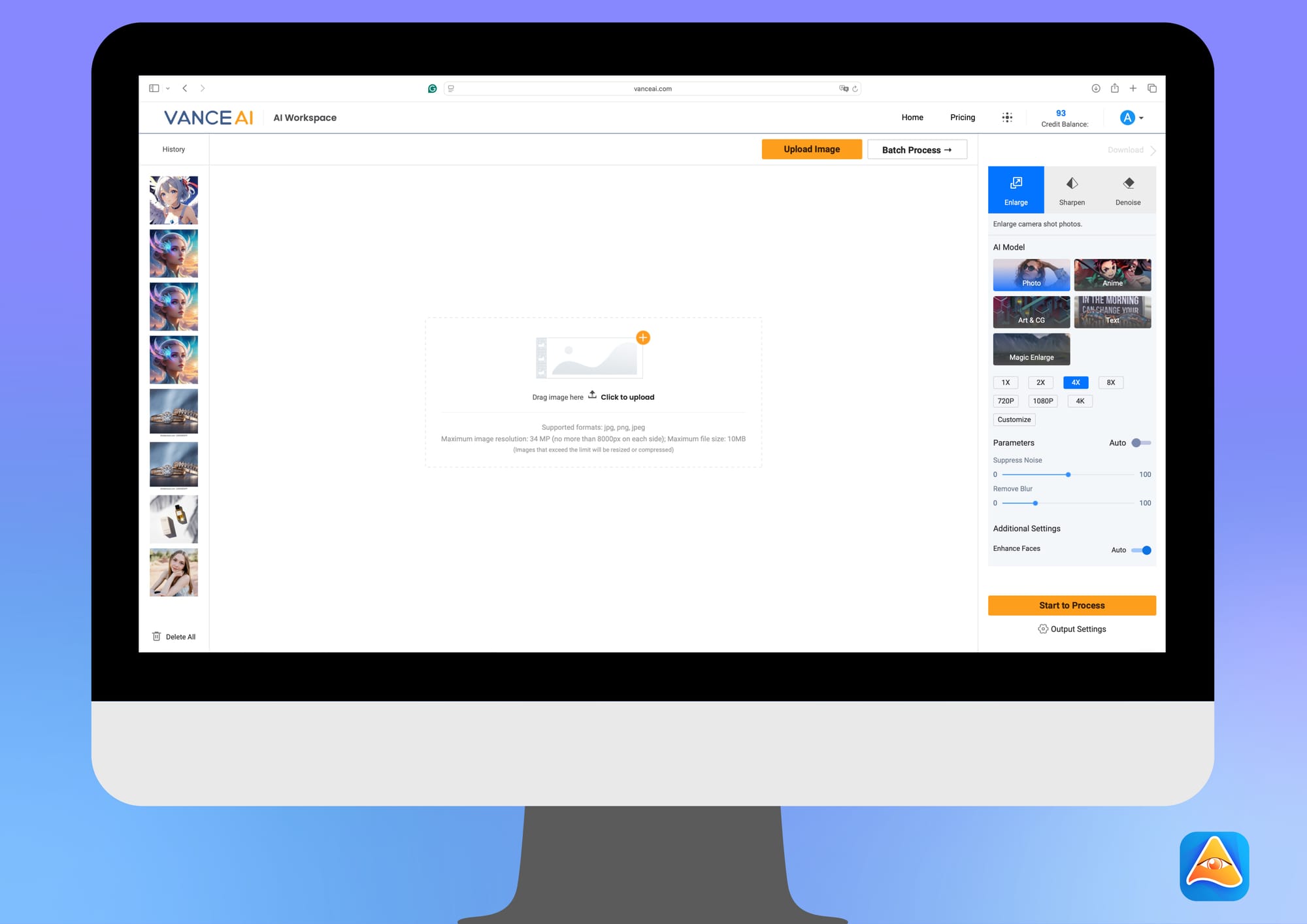 VanceAI is also easy on the web, but it adds a Windows desktop app for people who prefer working locally. Online, you upload, choose how big you want to go, run it, and then review the finished result in your “Processed” area (you check the output after, rather than seeing changes live). The controls use plain language: “remove blur,” “reduce noise,” and face enhancement, so you can pair quick fixes with the upscale.