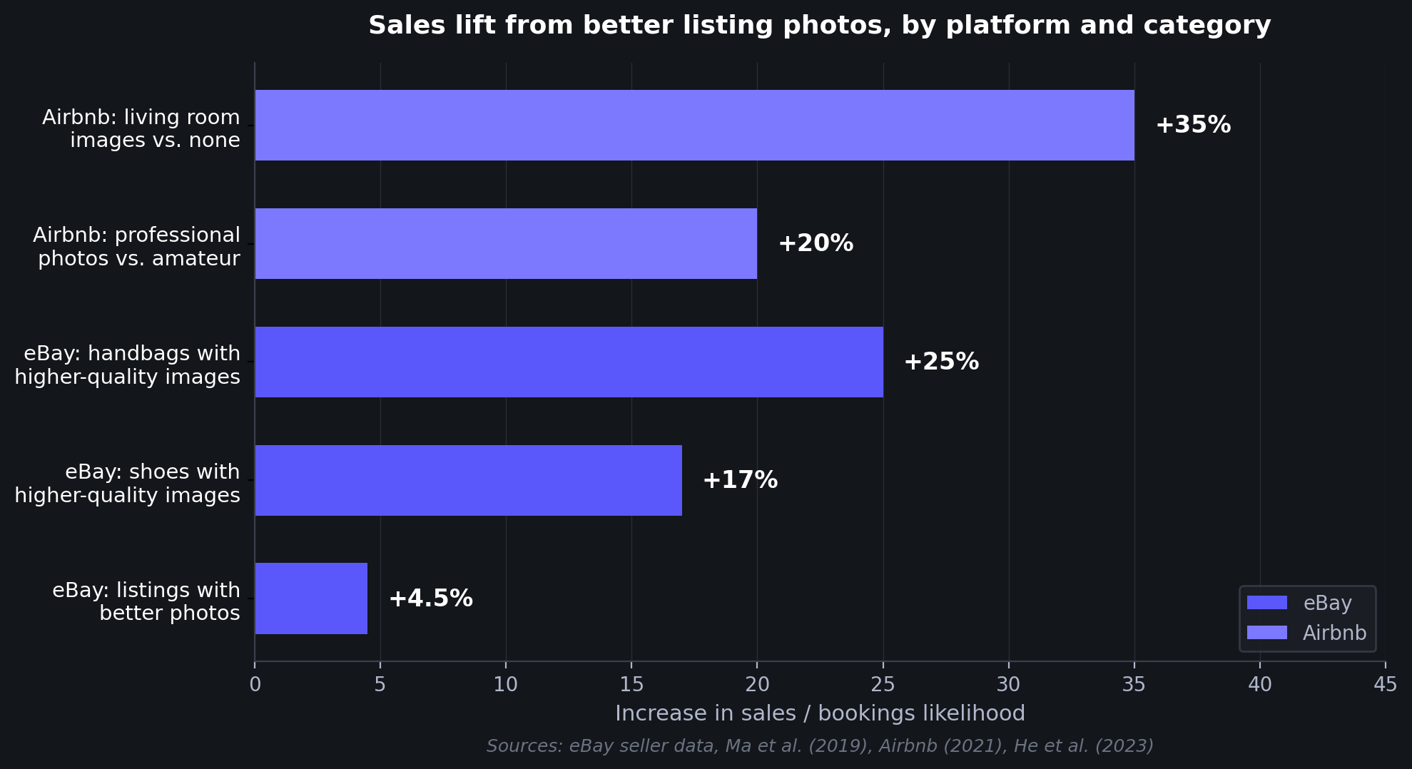 Marketplace photo dynamics extend beyond physical products. Airbnb, essentially a marketplace for short-term rentals, has produced some of the strongest evidence on how listing images affect demand.