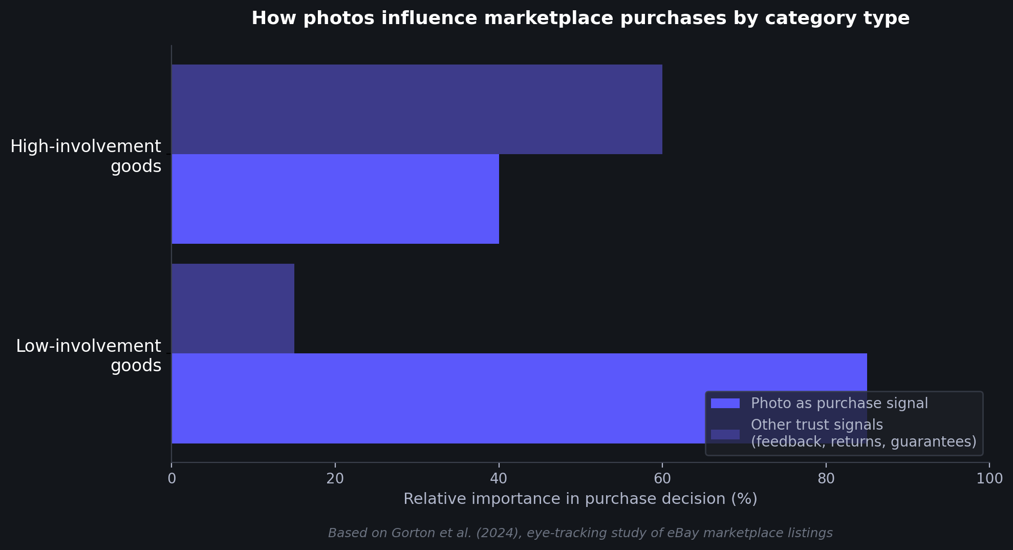 This dynamic is fundamentally different from traditional e-commerce, where a brand's reputation and website design do some of the trust-building work. (We covered that broader picture in our research review of product image quality and e-commerce performance.) On marketplaces and classifieds, the photo carries more weight because the seller is often unknown. The listing image is the primary trust signal.