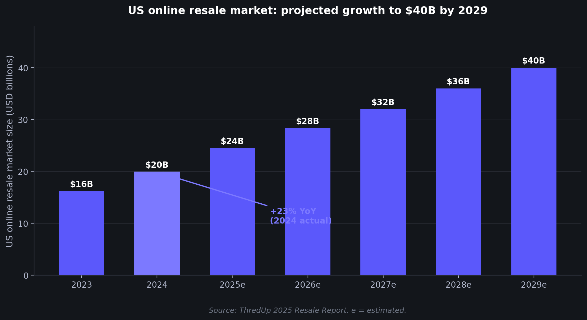 ThredUp's 2025 Resale Report shows the US secondhand apparel market grew 14% in 2024, with online resale specifically growing 23%. The report projects online resale will reach $40 billion by 2029. In 2024, 58% of US consumers shopped secondhand.