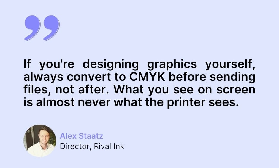 - Convert RGB designs to CMYK early