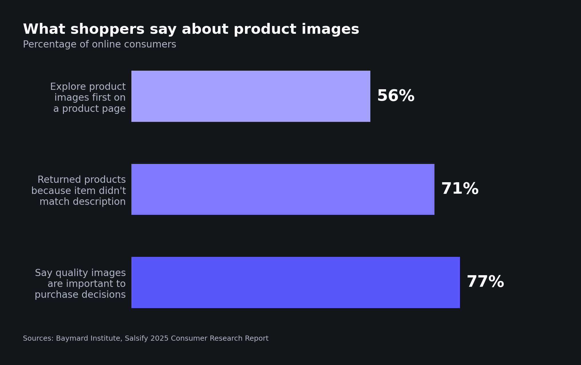 Industry data from Salsify's 2025 Consumer Research Report reinforces this: 77% of shoppers say high-quality images and videos are important to their purchase decisions.