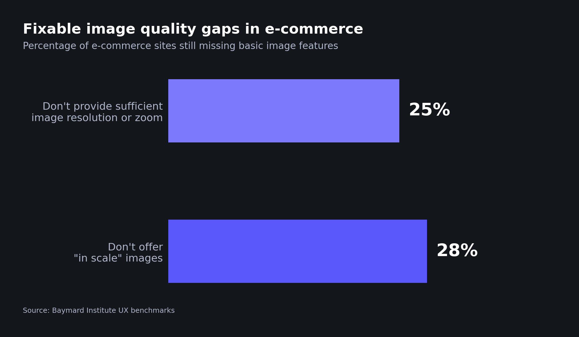 Baymard Institute's benchmarks put numbers on the opportunity: 25% of e-commerce sites still don't provide sufficient image resolution or zoom functionality, and 28% don't offer "in scale" images. These are fixable gaps that directly reduce returns.