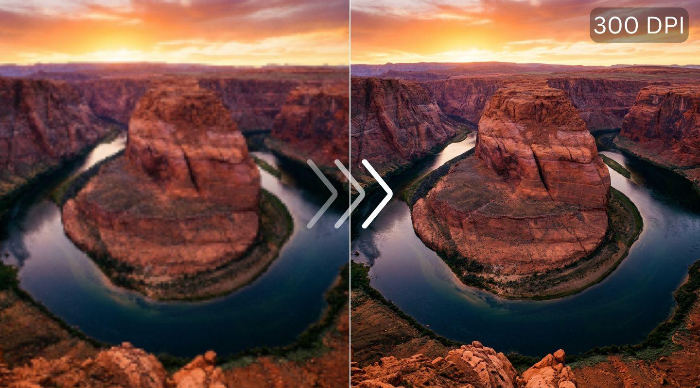 Small web images don't print well. The upscaler increases resolution so your photos hit 300 DPI at any size: posters, canvas, banners, merchandise. No softness, no pixelation.